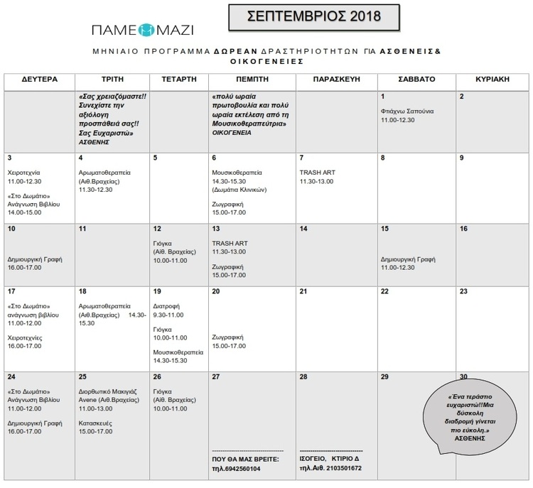 ΠΡΟΓΡΑΜΜΑ ΣΕΠΤΕΜΒΡΙΟΥ 2018 ΔΩΡΕΑΝ ΔΡΑΣΤΗΡΙΟΤΗΤΩΝ ΓΙΑ ΑΣΘΕΝΕΙΣ ΚΑΙ ΟΙΚΟΓΕΝΕΙΕΣ.