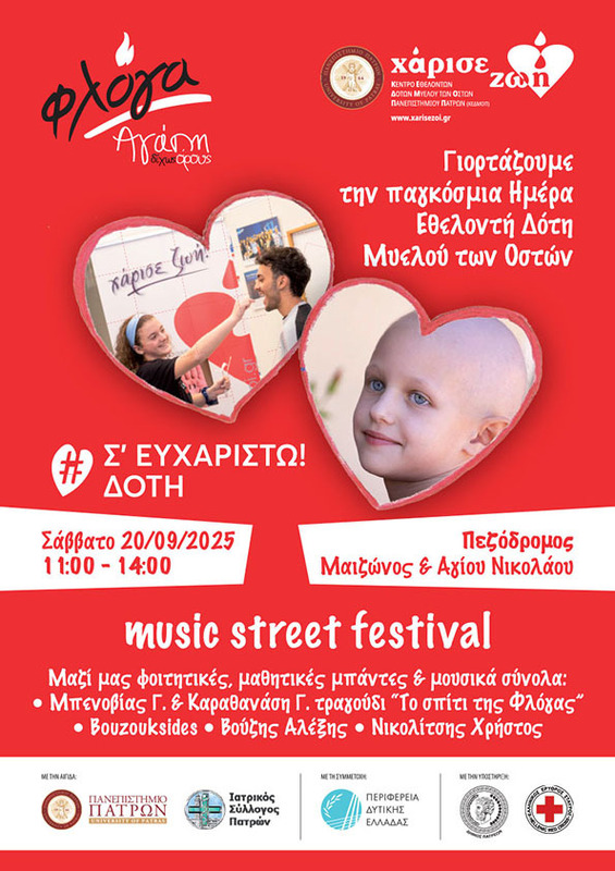Πρόσκληση στον εορτασμό της Παγκόσμιας Ημέρας Εθελοντή Δότη Μυελού Το Κέντρο Εθελοντών Δοτών Μυελού των Οστών «Χάρισε ζωή» & ο Σύλλογος Γονιών Παιδιών Με Νεοπλασματική Ασθένεια «ΦΛΟΓΑ» γιορτάζουν την Παγκόσμια Ημέρα Εθελοντή Δότη Μυελού των Οστών και σας προσκαλούν στο music street festival “Σ’ ευχαριστώ δότη” στον Πεζόδρομο της Μαιζώνος & Αγίου Νικoλάου το Σάββατο 20 Σεπτεμβρίου 2025 από 11:00 έως 14:00.